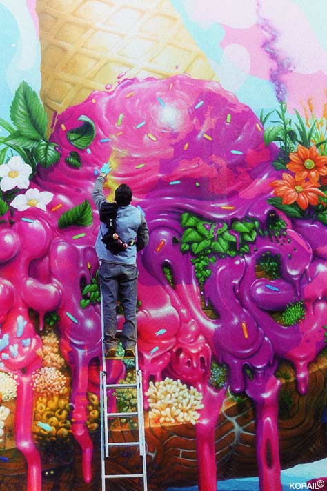 His murals stand out for their organic and fluid style, where forms seem to pulse with inner energy, blending abstraction and figuration in a carefully balanced harmony. His work evolves toward a figurative painting rich in symbolism, shaped by the territories he explores and by his poetic vision of the contemporary world. Each of Korail’s pieces becomes an invitation to an inner journey, a dialogue between humanity and nature, between memory and matter.